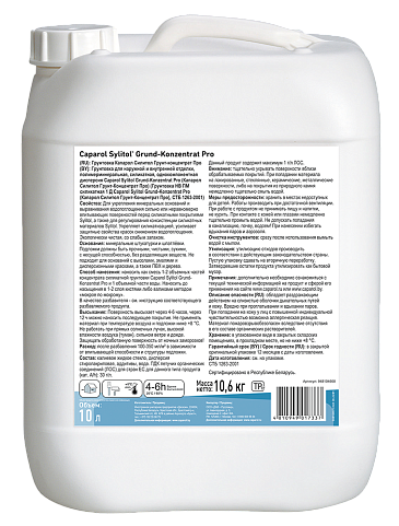 CAPAROL Sylitol Grund-Konzentrat Pro - это специальный концентрат грунтовки глубокого проникновения, разработанный для внутренних и наружных работ. Применяется исключительно в разбавленном виде для улучшения адгезии последующих защитно-отделочных покрытий.