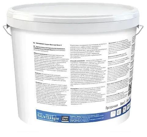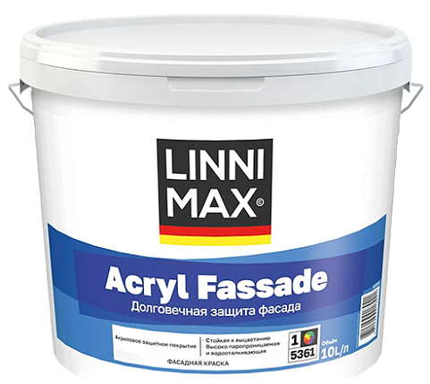 LINNIMAX ACRYL FASSADE - это водно-дисперсионная акриловая краска, предназначенная для создания декоративно-защитных фасадных покрытий. Обеспечивает белые и цветные, матовые, светостойкие, устойчивые к щелочам, паропроницаемые и водоотталкивающие покрытия.
