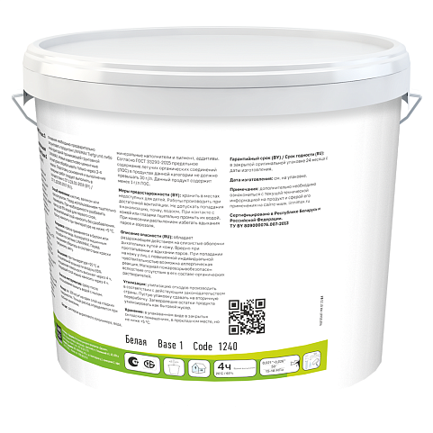 Храните краску в плотно закрытой оригинальной упаковке при температуре от +5°С до +35°С. Транспортировка разрешена всеми видами крытого транспорта в пределах температур от 0°С до +45°С с учетом правил грузоперевозок. Срок годности — 24 месяца с момента производства.